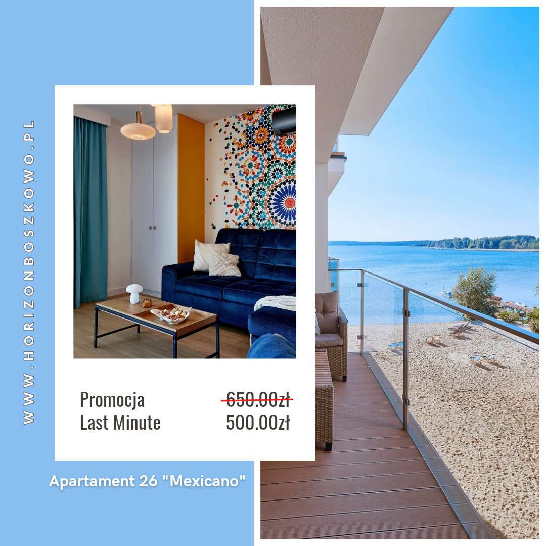 Apartament 26 "Mexicano" to zachwycający kolorowy apartament, który wprowadza radosny klimat. Znajdujący się na drugim piętrze, oferuje przepiękne widoki na jezioro oraz plażę z balkonu, salonu i sypialni. W apartamencie czeka na Państwa wszystko, co potrzebne do komfortowego pobytu: w pełni wyposażoną kuchnię (ekspres do kawy, toster, czajnik), pralkę, suszarkę do włosów, ręczniki, klimatyzację oraz dwa telewizory SmartTV. Dodatkowo, do dyspozycji gości są leżaki, które można zabrać na plażę, oraz stylowy zestaw mebli tarasowych idealny do relaksu na świeżym powietrzu.